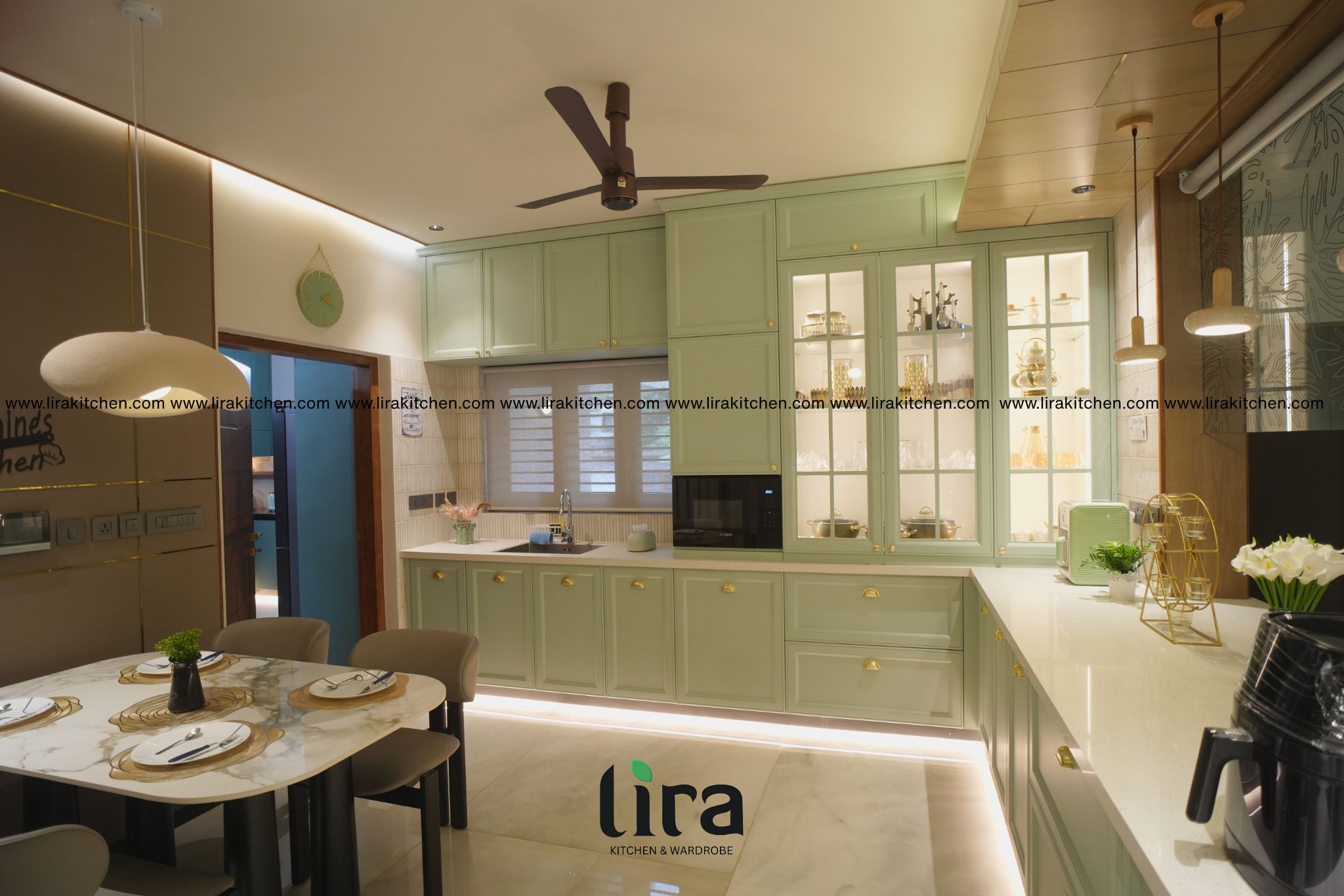 The new design concept for the modular kitchen is inspired by Indian aesthetics, which combines traditional warmth elegantly with modern charm, making it a sophisticated choice for open kitchens. - Teal and Grey